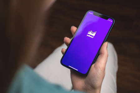 Kharkov, Ukraine - January 10, 2022: Woman uses Yahoo Finance app. Hand with Apple iPhone 12, mobile phone with logo