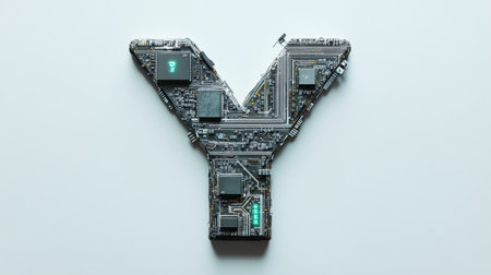 The letter Y designed with futuristic technology elements, such as microchips and digital grids, standing out on a minimalist white background.