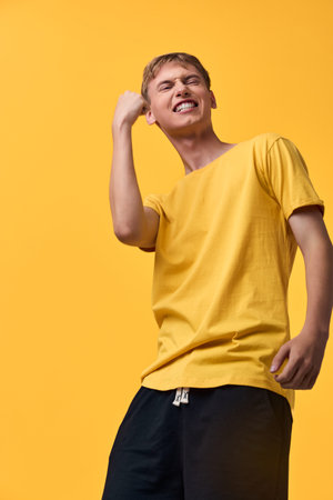 Man in a yellow shirt performs energetic dance movement against a bright studio backdrop, displaying a joyful pose, confident attitude and dynamic energy in a moment