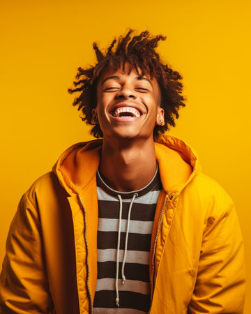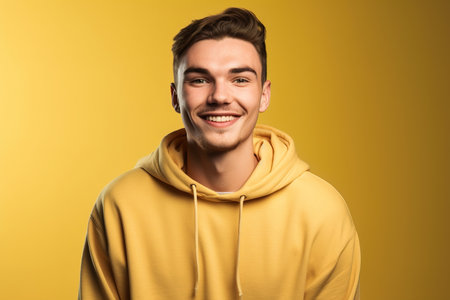 A young man is smiling and wearing a yellow hoodie. The image has a bright and cheerful mood, with the yellow color of the hoodie and the man's smile adding to the overall positive atmosphere