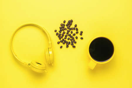 Headphones, a cup of coffee and coffee beans on a yellow background. Morning accessories.