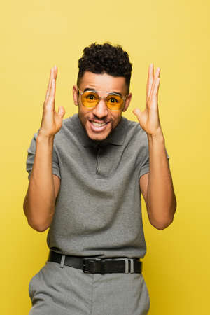 smiling african american man in sunglasses and grey tennis shirt gesturing isolated on yellow