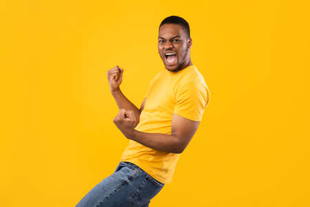 Emotional Black Man Shaking Fists Celebrating Success Over Yellow Background