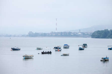 Zemun Quay (Zemunski Kej) in Belgrade, Serbia, on the Danube river, seen in autumn, during a foggy afternoon. Boats can be seen in front, and Belgrade center in background.
