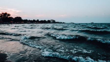 A scenic view of dark, choppy ocean waves reaching the shore. In the distance, a coastline with trees and buildings is silhouetted against a pale, overcast twilight sky.