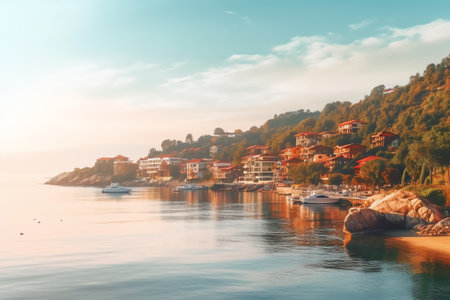 Calm coastal scene featuring a tranquil sea with gentle waves under a clear blue sky. A small harbor and picturesque landscape offer a serene atmosphere, perfect for relaxation and tranquility.