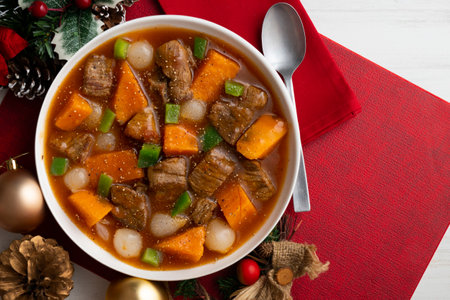 Beef stew with pumpkin and green beans. Top view table with Christmas decoration.