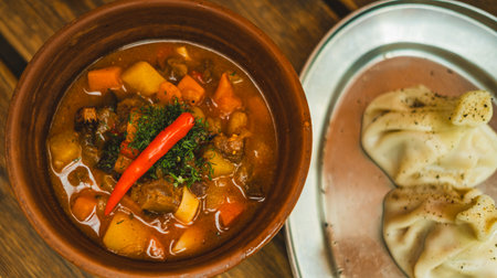 A vibrant bowl of lagman rich in beef and vegetables is beautifully garnished with a chili pepper accompanied by traditional khinkali dumplings on a sleek platter creating an inviting meal