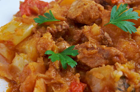 Marqa batata, potato stew, Tunisian cuisine, Traditional assorted African dishes, Top view.