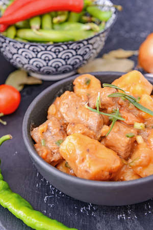 Delicious fresh cooked stew with pork meat or beef with potatoes, carrots, spices and herbs on a dark concrete background