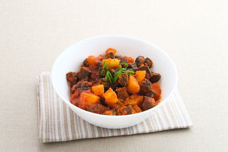 Sambal Goreng Ati Kentang, javanese (Indonesia) traditional food. Served in white bowl.