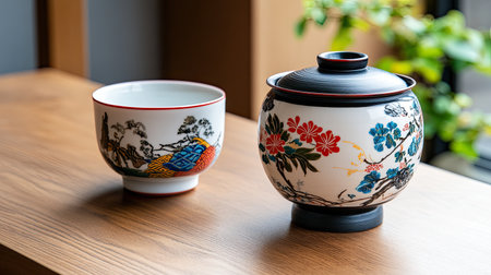 A traditional Japanese tea set featuring a beautifully designed bowl and teapot, elegantly placed on a wooden table, perfect for showcasing culture and artistry.