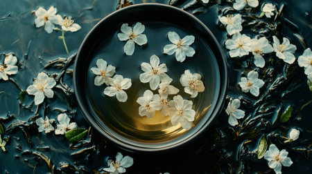 A serene black bowl filled with still water showcases delicate white flowers floating gracefully on the surface, creating a peaceful atmosphere for relaxation and meditation.