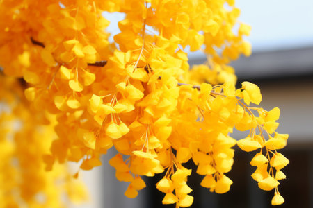 a tree with yellow flowers in front of a house