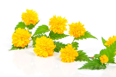 Kerria japonica, a beautiful yellow flowering shrub. Here seen as a single branch in full bloom. This is the cultivar Pleniflora.