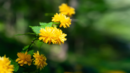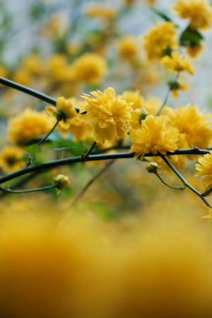 Vivid close-up of a Japanese Kerria branch with bright yellow flowers and buds. Fresh, colorful spring bloom with vibrant natural details.