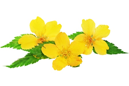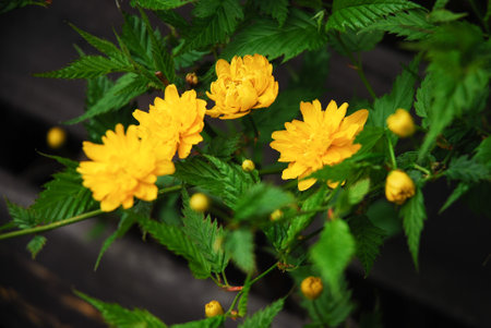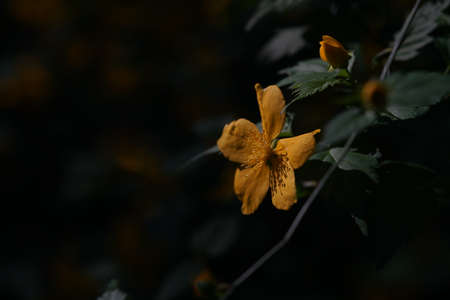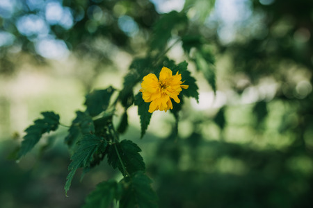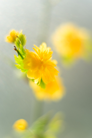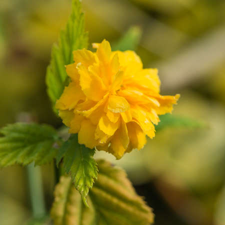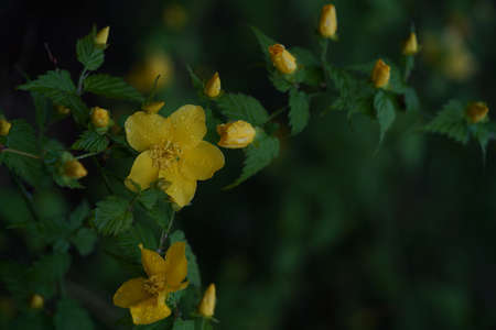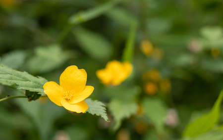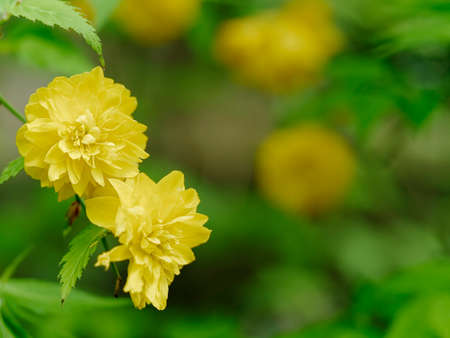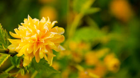 Japanese kerria flowers. Rosaceae deciduous shrub. It grows in swamps and shades of trees and produces many yellow flowers from April to May.