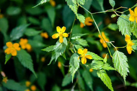 Yellow flowers on a background of green leaves in the spring forest.