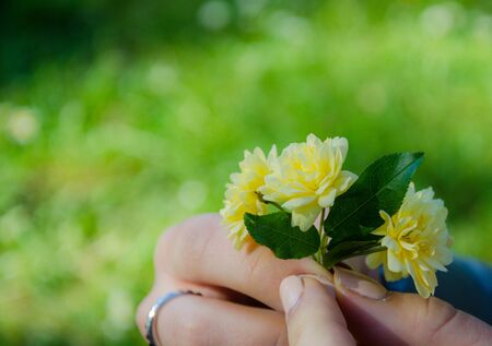 Hands holding flowers at the garden