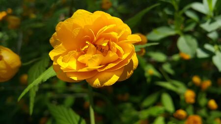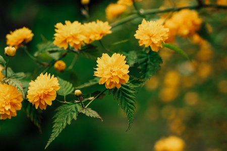 Flowering bush kerria Japanese terry. Beautiful yellow flowers in the spring garden. Close-up, macro, selective focus