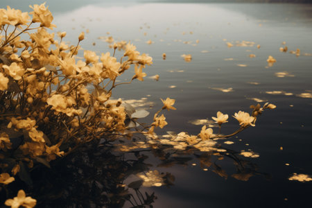 A close-up captures vibrant yellow flowers gently drifting on the water's surface, accompanied by scattered autumnal leaves. The image displays a cool color palette with soft textures and natural lighting. This serene composition offers potential for various creative projects, including editorial features or decorative elements.