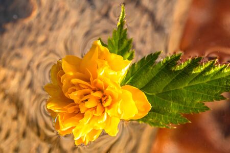 Macro shot of Kerria japonica Pleniflora flower isolated on water. Yellow Japanese rose close up .