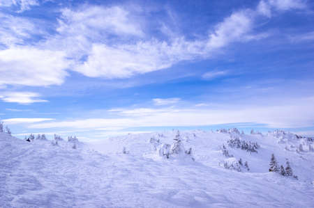 Beautiful winter mountain peak landscape, blue sky and snow-covered trees (Daegwallyeong, Gangwon-do, South Korea)
