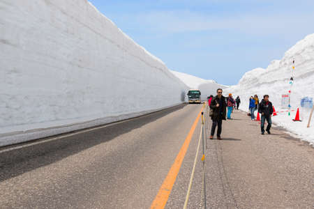 Tateyama, Japan - April 21, 2019 : Unidentified tourists visiting snow corridor on Tateyama Kurobe Alpine Route, Japanese Alp in Tateyama, Japan.