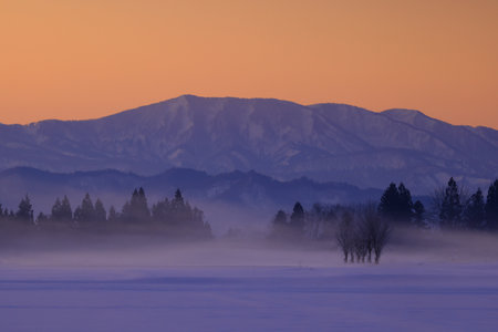 Aerial view of snowy mountain hills with morning mist or fog at sunrise in Nagano City, Japan. Nature landscape background.