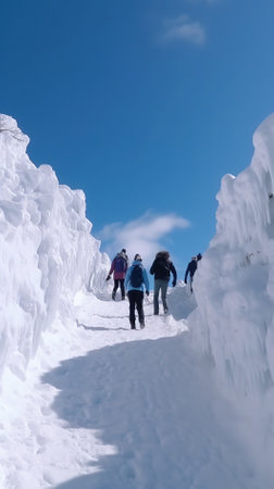Tateyama, Japan - 2 May 2016: Tourists walk along snow corridor. This snow wall is a part of Kurobe Alpine Route which offers spectacular views around Tateyama mountain.