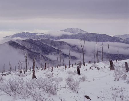 Landscape of snow mountain view with snow covering tree and white snow ground in hazy weather day