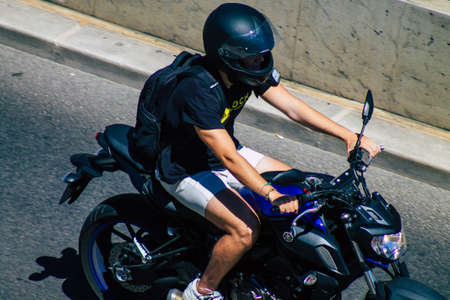 Lisbon Portugal july 25, 2020 View of unidentified people driving a motorcycle in the streets of Lisbon, the hilly coastal capital city of Portugal and one of the oldest cities in Europe