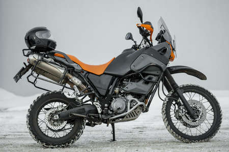 Kyiv, Ukraine 10.02.2020: Sports bike parked in a field under morning light
