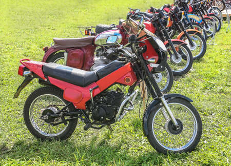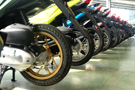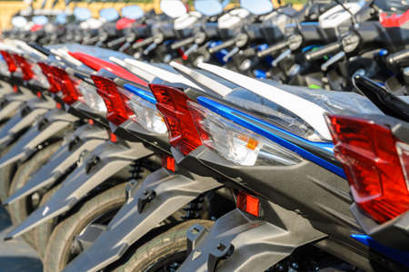 Motorbikes, motorcycles scooters parked in row in city street. Close up of details. Bikes