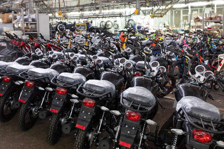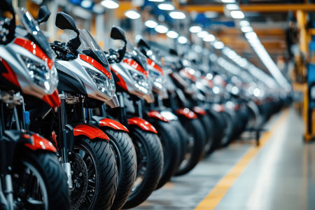 Rows of newly manufactured motorcycles parked in a modern automotive factory, ready for distribution along the assembly line.