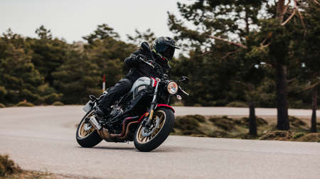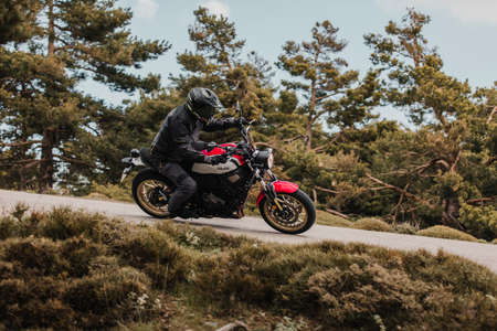 Calar Alto, Spain - May 5th 2021: Man riding a Yamaha XSR700 motorcycle in a beautiful road turn, during Dunlop Xperience event in AlmerÃa, Spain.