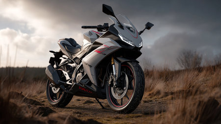Modern Honda Motorcycle Parked Outdoors Under an Overcast Sky, Showcasing Sleek Design