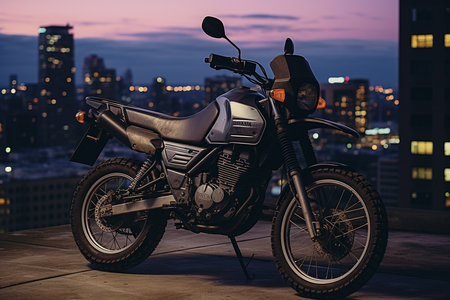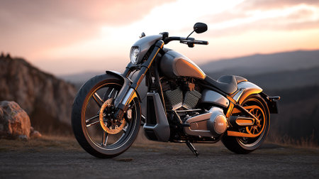 Gray motorcycle on mountaintop at sunset, adventure, freedom and exploration concept