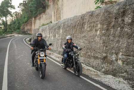 asian men riding motorbike on the street around countryside