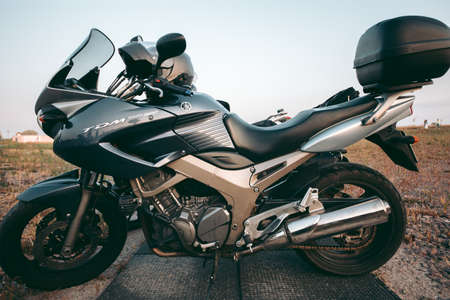 Kyiv, Ukraine 10.02.2020: Sports bike parked in a field under morning light