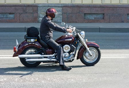 Man rides a motorcycle in the city.Young man in helmet and equipment rides a motorcycle on the road.Motorcyclist riding a bike during the day on the road