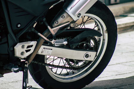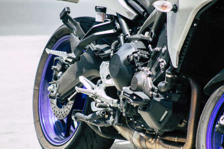 Seville Spain July 12, 2021 Closeup of the mechanics of a motorcycle parked in a parking lot located in the city center of Seville, an emblematic city and the capital of the region of Andalusia, in the south of Spain