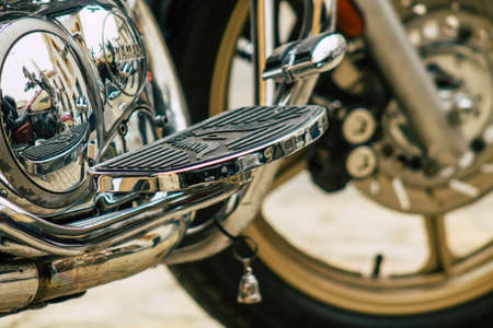 Motorbike with shining parts, close up. Motorcycle engine, toned