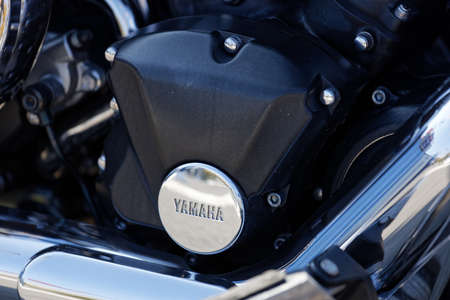 Ulyanovsk, Russia - October 03, 2020. Engine of motorcycle with Yamaha text logo.