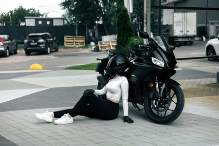 Biker girl in sportswear sitting on the ground near her motorcycle.