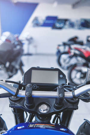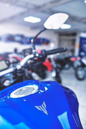 Motorcycles in the showroom Yamaha shop. Store motorcycle, professional tools, selective focus.