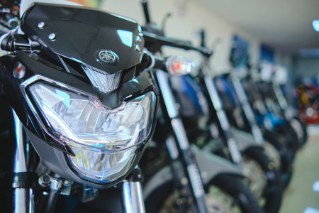 Lima, Peru - May 15, 2021: Yamaha motorcycle shop, Yamaha MT03 abs, Motorcycles in the showroom Yamaha shop. Store motorcycle, professional tools, selective focus.