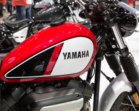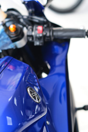 Bangkok, Thailand - November 14, 2017: Close up of YAMAHA logo on the motorcycle body. YAMAHA is one of the famous motorcycle manufacturers in the world. Yamaha Motor Company is a Japanese manufacturer of motorcycles, marine products such as boats and out