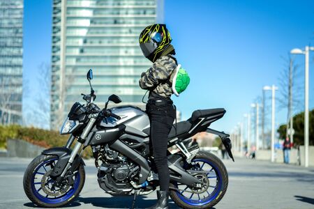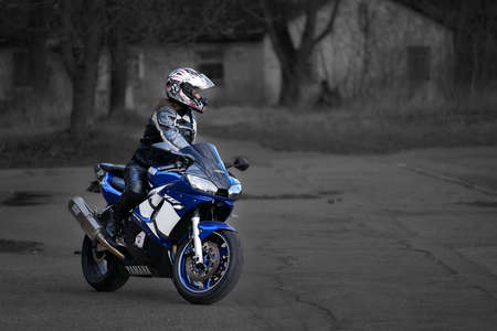 05.04.2020-Riga, Latvia - Girl and motorcycle. Black helmet. Girl posing with motorcycle girl biker. Blue motorcycle. Motorcyclist at blue motorcycle