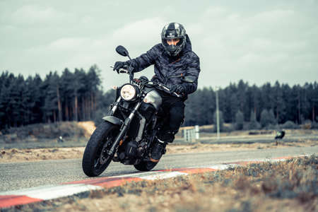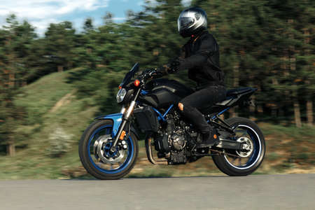 10-09-2020 Ropazi, Latvia Motorcyclist at sport bike rides by empty asphalt road. sport bike.